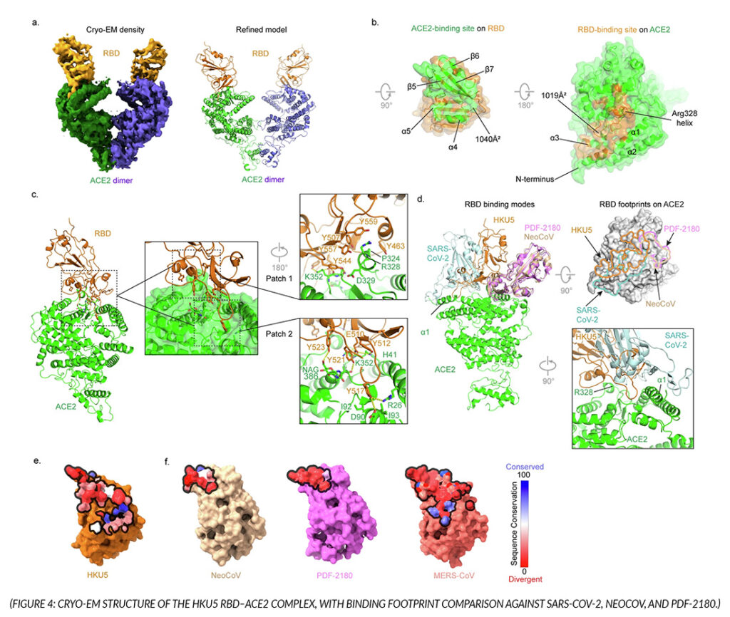 To characterize this interaction structurally, the team collected cryo-EM data on an Apollo-equipped Titan Krios, resolving the HKU5 receptor-binding domain in complex with P. abramus ACE2 at 4.2 Ă…. The structure revealed a binding mode distinct from all other known ACE2-using coronaviruses, driven by a tyrosine-rich interface that targets a different region of ACE2 than SARS-CoV-2. This was confirmed through mutagenesis of both the RBD and ACE2 binding interface.