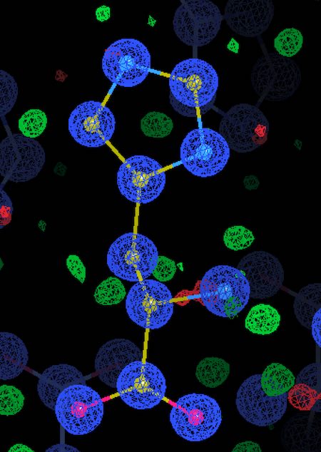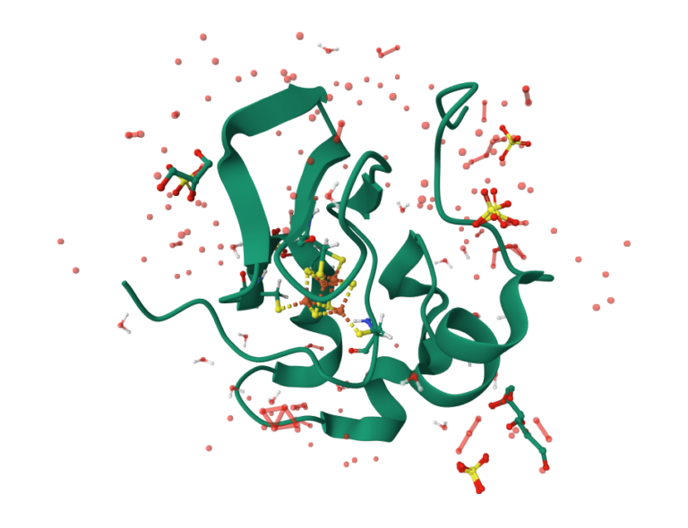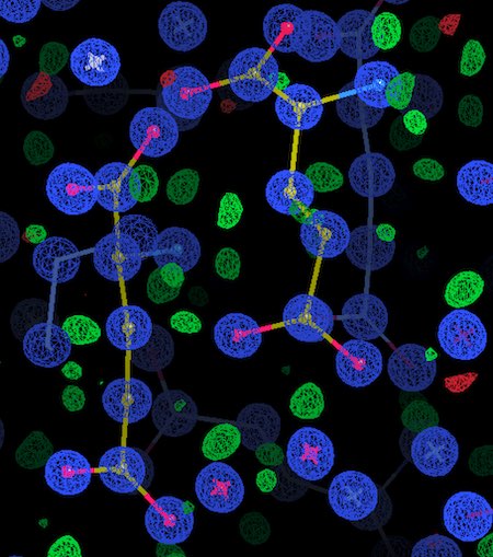 Figure 2: Ultra-high resolution (0.48 Å) X-ray structure of a high-potential iron–sulfur protein (HiPIP) with the distribution of valence electrons in addition to atom positions. Such features go beyond typical high resolution structures and reveal detailed electronic and bonding features in a biological electron-transfer center.